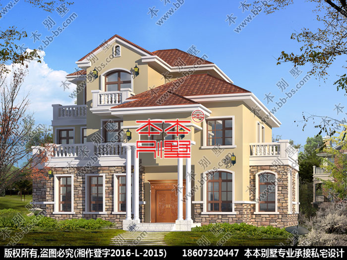 方案一:屋頂為紅色,文化石,歐件構(gòu)件及配色為白色。如果按本配色完成,別墅整體會(huì)很打眼,但是白色過幾年就會(huì)變色,所以不建議業(yè)主最終選擇。
