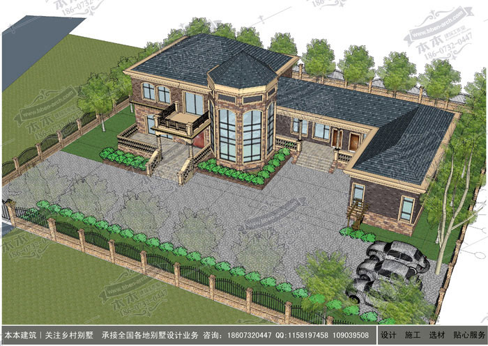 左邊有主屋.右側(cè)有雜物間.中間的八角形屋頂.是整棟屋的點睛之筆.雜物的門廊將主屋與雜房生動的連接起來.整體看更有氣勢