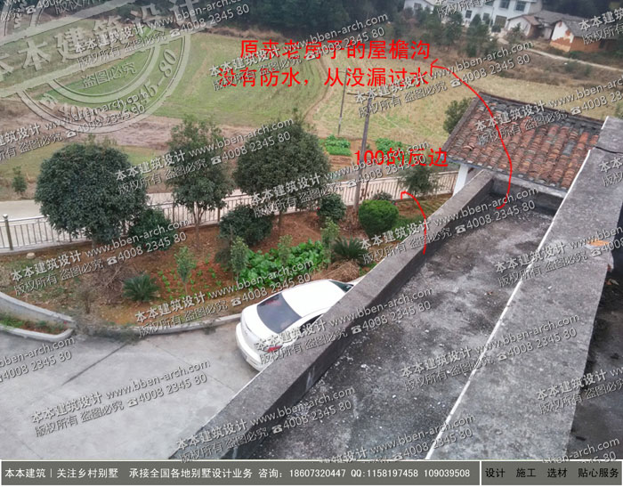 老房子建于上世紀(jì)九十年代,平頂做的天溝沒(méi)有做防水,也從沒(méi)有漏過(guò)水。從圖中可以看到,前面的坪停車后空間并不大。